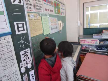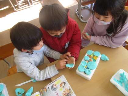 図工の時間に粘土ででこぼこを写しとり、お互いにクイズを出し合いました。どこのでこぼこを写しとったのか、その場に友達を呼んで教える姿も見られました。