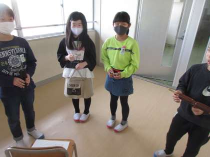 音楽の様子です。まとまりのある音楽作りをしています。楽器の音色ごとに分けたり、強弱を目立たせたりするなど、工夫して取り組む姿が見られました。