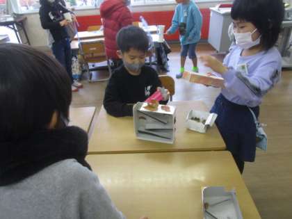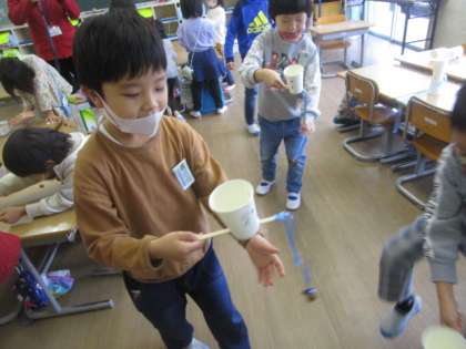 生活科の時間に作ったおもちゃでお互いに遊びました。友達同士でルールを工夫して、一緒に遊んだり、競ったりする姿が見られました。
