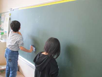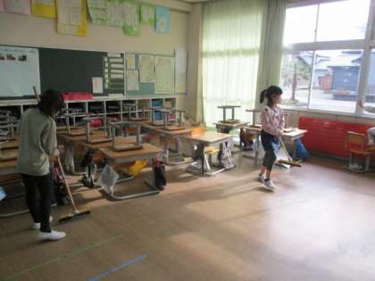 清掃の時間、自分の割り当てられた仕事に一生懸命取り組んでいます。