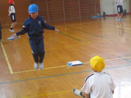 体育の時間に縄跳びの両足後ろ跳びを練習しました。縄を片方の手に持って後ろにリズムよく回すのを練習した後に両手で持ってしました。後ろ飛びは子供たちにとって難しかったようです。たくさん練習して上達してほしいです。