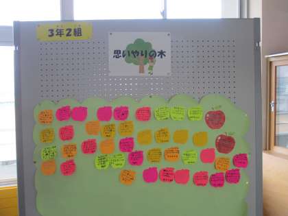 今日から「思いやりの木」の活動がスタートしました。友達に親切にしたり、親切にされたことを付箋に書いて、各学級ごとに思いやりの木に貼っていきます。今日は初日でしたが、親切な行動を見付けるとすぐに付箋に書く姿が見られました。周囲の人の親切な行動にも目を向けられることこそが素敵だなと感じます。