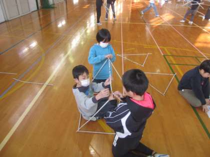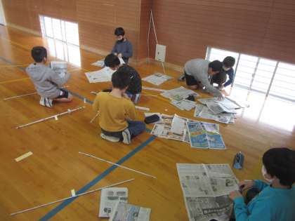 【4年生】つなぐんぐん〜体育館で〜 公開日 2020/12/10 更新日 2020/12/10 4年生 体育館で、図工をしました。広い場所で、自分の表したいものを作りました。声をかけあっている姿がとてもすてきでした。
