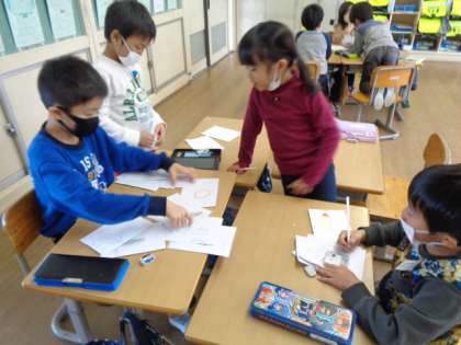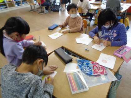 お店屋さんごっこの準備を進めています。今日は品物カードと看板づくりをしました。みんな夢中になって楽しんでいます。