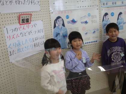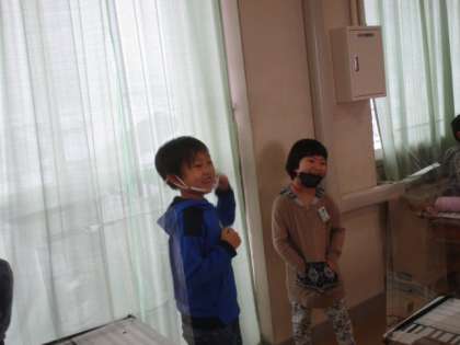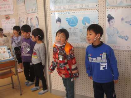 音楽で『やまびごっこ』を歌いました。どの子も大きな口を開けて楽しそうに歌っています。今日の授業では、他にも2学期に習った海やなかよし、日の丸を歌いました。