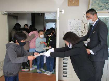 【5年生】受賞伝達 公開日 2020/12/21 更新日 2020/12/21 5年生 臨時休校中に描いたBFC防火ポスターの受賞伝達を行いました。市内の子供たちが大勢提出した中での受賞。力作を描き上げるまでの努力、よくがんばりました。おめでとう。
