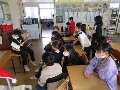 今日は「もりのクリーニングやさん」を読んでくれました。クリーニング屋のうさぎが洗って干したシーツがなくなり・・・かわいい挿絵の絵本でした。