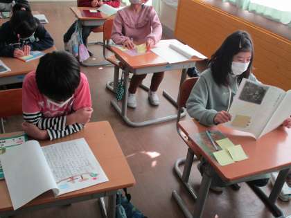 国語科「たから島のぼうけん」の学習では、みんなが作った物語を読み合い、感想を伝えました。読みながらクスクスと笑っている様子も見られました。子供たちの想像力に驚かされます。明日持ち帰りますので、是非保護者の皆様にも読んでいただきたいと思います。