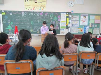 2学期をがんばったご褒美として、今日はクリスマス会を行いました。子供たちと話し合い、係ごとに出し物をすることにし、準備を進めてきました。
