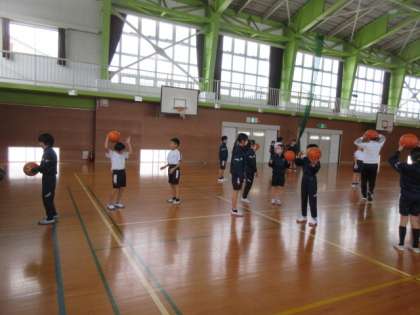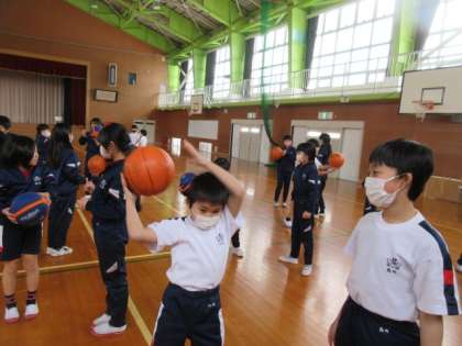 バスケットボールとは少しルールが違いますが、バスケットボールを使って学習します。今日はボールと仲良くなる練習をし、ペアの友達と仲良く活動しました。