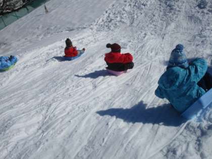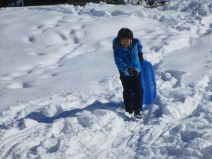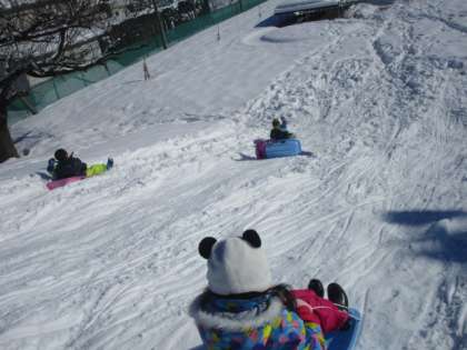 築山では冬を感じられる遊びとして『そり』をしました。今日の朝の冷え込みで滑るコースがとてもつるつるになっていましたが、スピードが出て楽しいと言って楽しそうに活動していました。