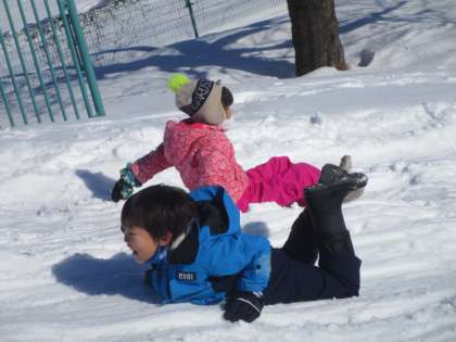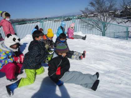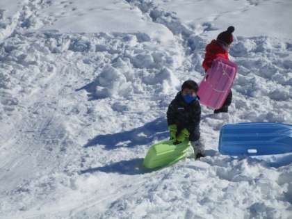 そりを使わずにおしりやうつぶせで滑りました。うまく滑るにはコツがあるようで、上手な人のところに行ってアドバイスを求める姿も見られました。