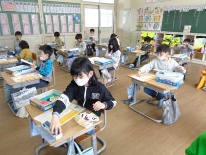 【1年生】位取り表 公開日 2021/01/25 更新日 2021/01/25 1年生 大きな数で「一の位」「十の位」を学習しています。今日は、算数セットの位取り表を使って、いろんな2桁の数を算数ブロックと数カードで表しました。子供たちは休み時間、位取り表の裏の100までの数のすごろくゲームで遊んでいました。