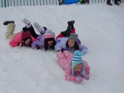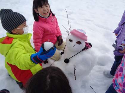 今日は予定にはなかったですが、もしかして最後の雪遊びチャンスかもと思い、雪遊びをしました。子供たちは互いに教え合っていろんな滑り方を試したり、雪だるまを作ったりと、思い思いに雪遊びを楽しみました。