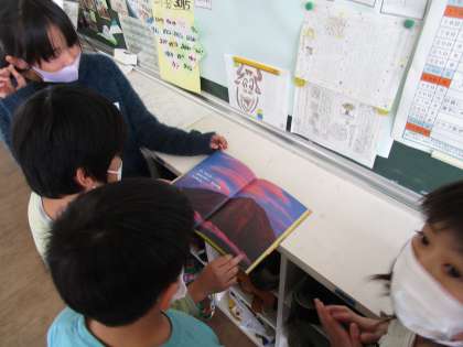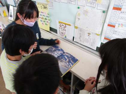 音楽科の学習で歌った「ふじ山」の写真が載った本を借りた子がみんなに見せてくれ、様々な表情を見せるふじ山に驚いていました。また、わくわく新聞&イラスト係の人が作ってくれた塗り絵を楽しんでいる子もいました。きれいに塗った絵をプレゼントしてくれ、嬉しかったです。