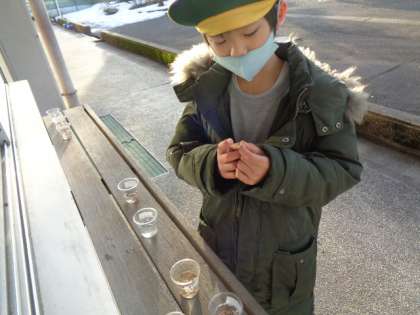 【1年生】氷を作りたい! 公開日 2021/01/26 更新日 2021/01/26 1年生 氷をつくろうと数日前から水を入れたコップを外に置いています。今朝は冷え込んだので期待しましたが、違っていてがっかりです。でもよく観察すると、水面の周りに薄いきれいな氷が張っていることを発見しました。いつか氷になるでしょうか?楽しみです。