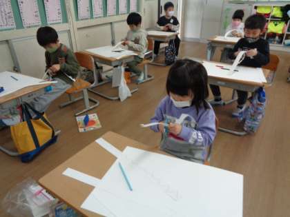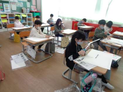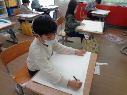 版画の制作に入りました。1年生はシールローラー版画を作ります。どんな風に作っていくか説明を聞いてから、さっそく外枠づくりをしました。すてきな作品にしましょう。