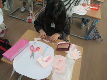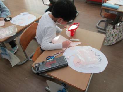 版画を作っています。だんだんパーツができあがってきました。顔ができあがったら、インクをつけて紙に写します。どんな作品ができあがるか楽しみです。