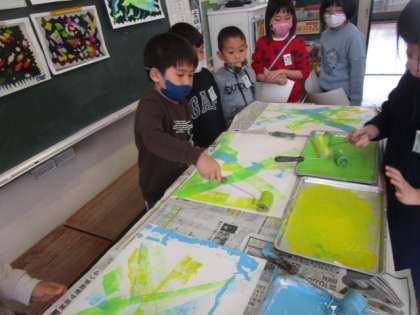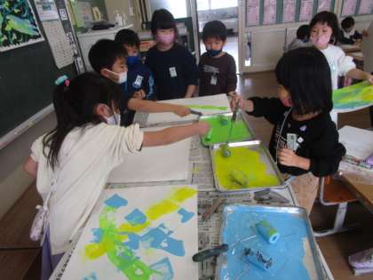 シールローラ版画で色をつけました。色の重なりや自分の作りたい世界と重ね合わせて色を置いていました。
