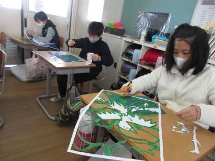 黙々と、ステンシル版画の制作を続けています。仕上がる子供も少しずつ増えてきました。来週、黒色の台紙に貼り、白色絵の具をのせていきます。