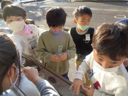「先生、凍っとる!」今朝の冷え込みで、ついに教室の外のコップやお皿の水が凍りました。子供たちは宝物のように目をキラキラさせてのぞき込んでいました。よく見ると中で水の玉が揺れていることも発見していました。冬ならではの美しさですね。