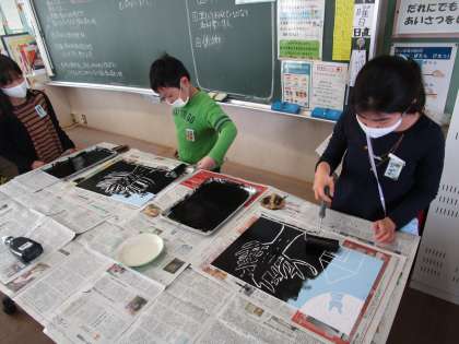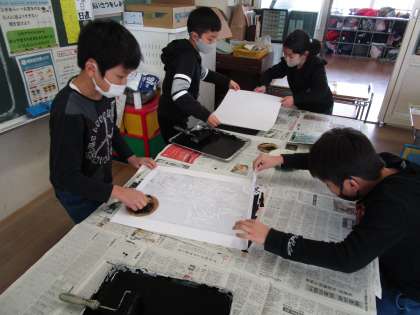 【3年生】図画工作 版画 公開日 2021/02/03 更新日 2021/02/03 3年生 図画工作科の学習で、版画の刷りの作業を行いました。初めての経験に今朝からワクワクしていた様子でした。 インクはむらなくたっぷりと、バレンでしっかり写るように擦り、できた作品を見て、「おお〜」「すごーい」と声をあげる子供が多く見られました。金曜日には色を付けたいと思います。すてきなモチモチの木に仕上げたいですね。
