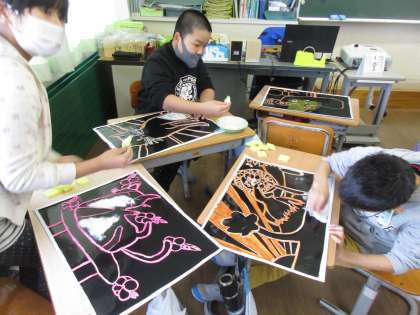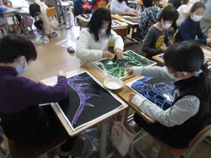 ステンシル版画に白色のポスターカラーで着色しました。スポンジを使ってポンポンポンと楽しそうに色をつけていました。明日で仕上げ、月曜日に自分たちの絵の具を使ってカラフルにして完成です。