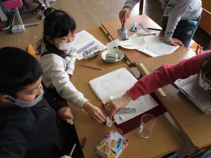 【3年生】理科 じしゃくにつけよう 公開日 2021/02/08 更新日 2021/02/08 3年生 理科「じしゃくにつけよう」の学習では、どんな物が磁石に付くのかを調べました。いろいろな物に磁石を付けたときのことを思い出して、磁石につくものを予想していました。実験をしながら、磁石に付く物の特徴や磁石に付く力に違いがあることなど、様々なことに気付いている子供が見られました。