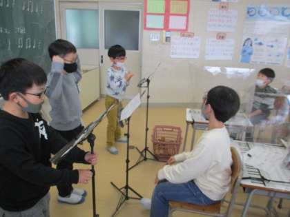 【2年生】リズムをつなげて 公開日 2021/02/08 更新日 2021/02/08 2年生 音楽では、同じグループになった友達と一緒にリズム送りをしました。呼びかけ用のリズムと応える用のリズムを作って、友達とリズム遊びをしました。