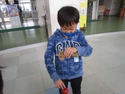 生活科の昔遊びの学習で、けん玉やおてだま、ヨーヨー、コマ回しをしました。友達の中には、コマ回し名人やけん玉名人もいて一人一人の新たな一面を見ることができました。
