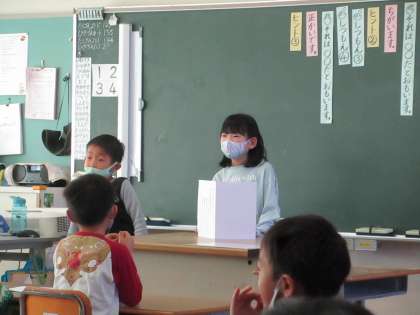 国語「これはなんでしょう」を学習しました。すぐに答えるものもあれば、なかなか答えにたどり着けないものもあり、楽しかったですね。子供たちは、ペアの友達と小さな声で相談したり、友達のお話を聞いて一生懸命考えたりと頑張っていました。