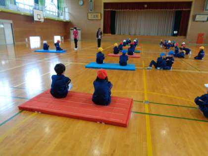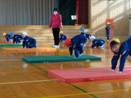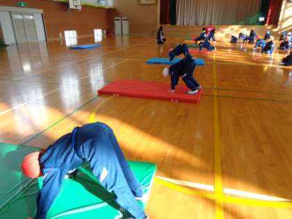 マットには耳があり、しっかり下に織り込んで使うことなど、安全な使い方を教えてもらいました。マットで「カエル跳び」「ゆりかご」等の技を練習しました。家でも練習してくださいね。