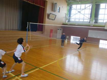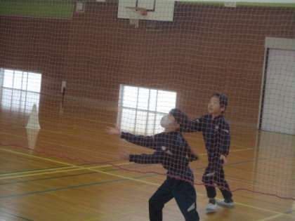 体育科では、ネットを挟んでビニール袋製のボールを投げ合い、相手のコートに落とすことができたら得点となる「ボンバーゲーム」をしています。