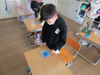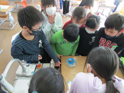 理科「じしゃくにつけよう」の学習では、磁石の極にはどんな性質があるかを調べました。磁石の引き合う力、退け合う力に興味を持ち、「このように動くのはどうしてだろう」と考えながら実験を行っていました。