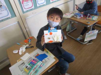 図工のはさみやのり、ボンドを使った工作の学習で『かざってなに入れよう』を進めています。中に入れる物を考えながら飾りや仕切りを作りました。すてきな作品に仕上がっています。