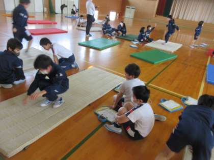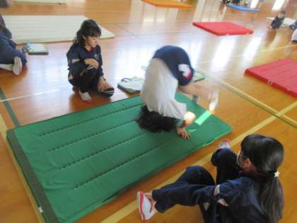 マット運動の様子です。今日は互いの前転や後転を見合い、アドバイスをしました。具体的にアドバイスできる子が増えています。より精度を高めた技になるようにこれからも切磋琢磨していきましょう。