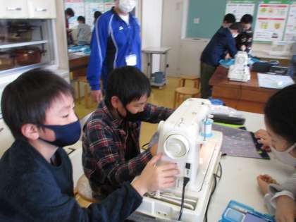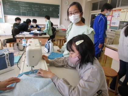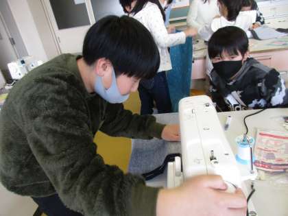 トートバッグの出し入れ口とラインテープ(持ち手)を縫いました。ミシンの使い方は前回よりもうまくなっているように感じます。教え合っている姿勢がすてきでした。