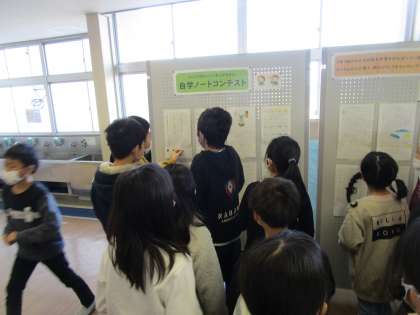 3年2組では、自学ノートコンテストを行っています。3、4年生に協力してもらい、「学習の仕方がいいな」「まとめ方が分かりやすいな」など、1番よいと思う自学ノートに投票し、自学ノート名人を決めます。休憩等に掲示してある自学ノートの前で足を止め、じっくりと見ている様子が見られます。友達から学び、生かす機会になるとよいと思います。