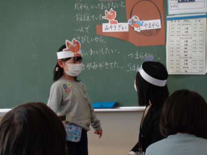 寂しく誕生日を過ごすヤマガラを思うと、いてもたってもおられず、ヤマガラの家に向かうミソサザイ。優しい人とは、人の気持ちを自分のことのように感じることのできる人。優しさについて、1組の子供も2組の子供も、一生懸命考えていました。