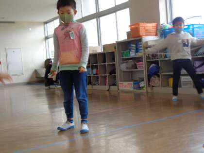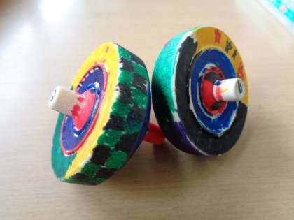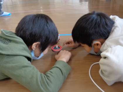 色付けを終えた子から、早速試しに回してみました。色や模様が回したときにどう見えるか、どの子も回るこまに顔を近付けて、上から、横から、下から、こまの様子をのぞき込んでいました。可愛いです。