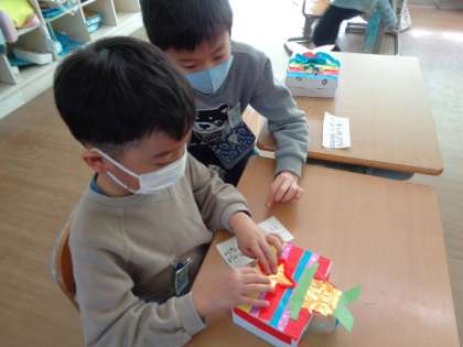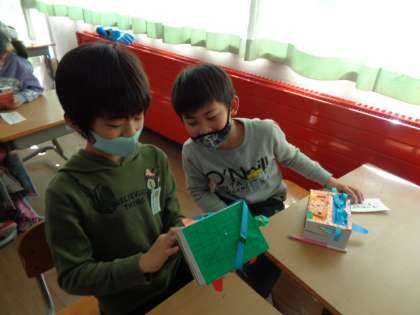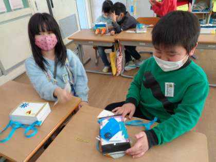 図工「かざって何入れよう」の作品が完成しました。友達とペアになって、自分の作品を紹介し合いました。どの箱もとっても素敵になりました。