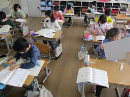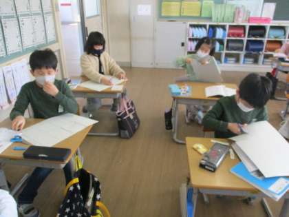 工作用紙を使って箱を作りました。面の数や、面と面が接する場所の長さについて考えました。