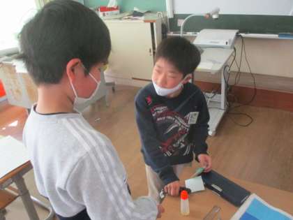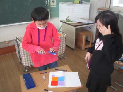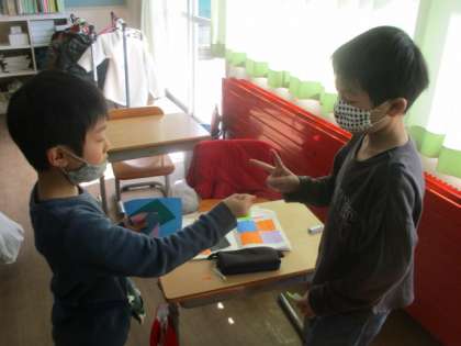 【2年生】分数じゃんけん 公開日 2021/03/01 更新日 2021/03/01 2年生 算数科では、折り紙を用いて「分数じゃんけん」を行いました。 初めに配られた1枚の折り紙ですが、友達とのじゃんけん勝負に勝つと相手の折り紙の半分を貰います。けれども、負けていくと自分の折り紙が半分になっていき・・・ 子供たちは、楽しみながら分数についての知識を深めることができました。