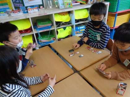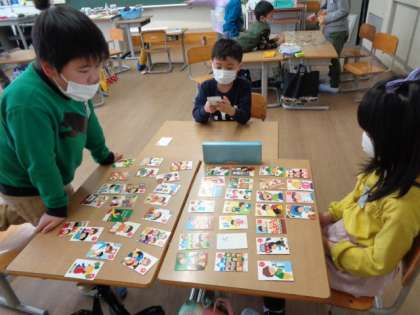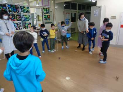 生活の時間に、子供たちがもってきてくれたかるたや花札、地域の方からいただいたお手玉等で遊びました。コマ回し競争も休み時間に白熱しています。「3・2・1、ゴーシュー!!!」のかけ声が定着しているようです。