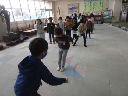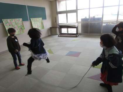 音楽の時間にいろいろな童歌を学習しました。日本に古くからある歌を歌いながら大縄や手遊び、絵描き歌をしました。おうちでもぜひ家族とやってみてください。