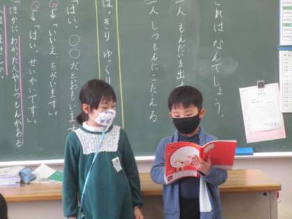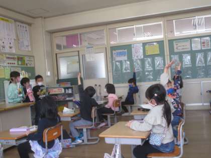国語の学習で学校にある物の特徴を捉えてクイズにして出す「これはなんでしょう。」をしました。問題は前回の授業の時にそれぞれのペアで考えていました。問題を出す人も答える人もはっきり・ゆっくり大きな声で話すことができました。