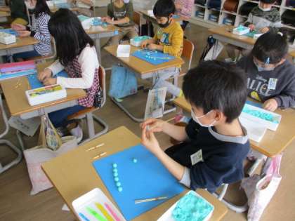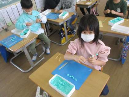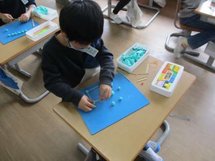 はこの形を、竹串と粘土玉を使って作りました。竹串や粘土玉の数は、辺や頂点に置き換えられると考えて作っていました。友達と教え合う姿も見せてくれました。