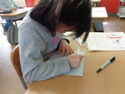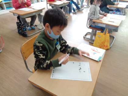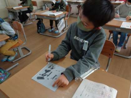 今年度から、1・2年生の書写で「水ペン」の学習が始まりました。子供たちは何度書いても消えていく不思議な紙に興奮して楽しんで書いていました。