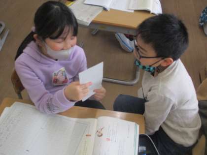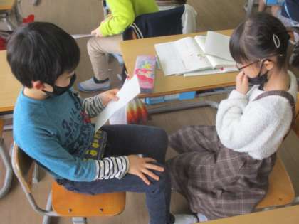 週明けに行う、「楽しかったよ2年生」の発表会に向けて、ペアで発表を聴き合い、最終確認をしました。