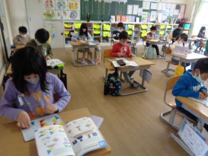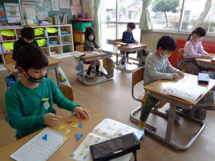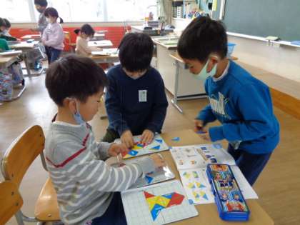 色板を使って、魚やロケット等の形を作りました。形も色も完コピ(完全複製)できるように、教科書をよくよく見ながら頑張りました。その後、自分で好きな形を作って遊びました。色板が足りない!と友達と合作してつくる子も。十分に慣れ親しんでほしいです。